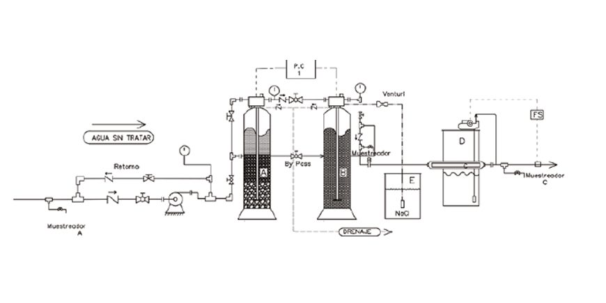 El sistema de tratamiento de agua está montado sobre skid para su fácil movilidad y con pintura resistente al ataque salino, cuenta con bomba de alimentación, sistema nominal de filtración de 20 micras, filtro con lecho de carbón activado y sistema de sanitización.